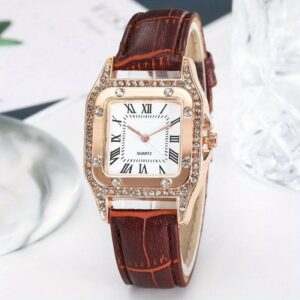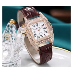 ساعة يد أنيقة للصبايا بشاشة مستطيلة حزام جلد لون بني غامق