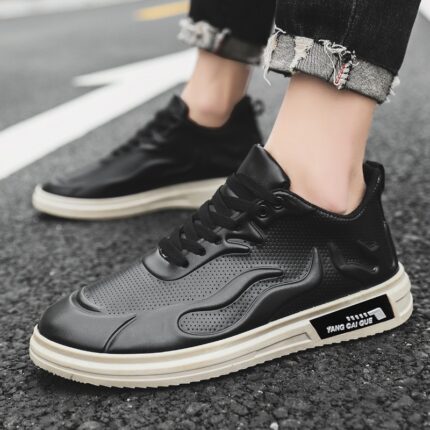 حذاء جلد كاجوال للرجال لون أسود ونعل بيج