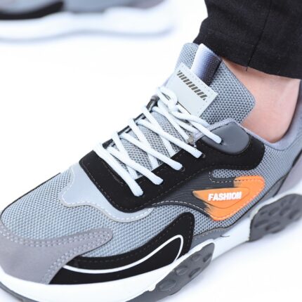 حذاء فاشن كاجوال جلد ونسيج للرجال لون رمادي ونعل رمادي وأسود