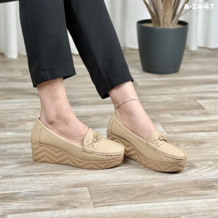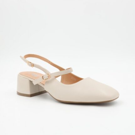 حذاء كعب ستاتي عريض متوسط مفتوح من الخلف لون بيج