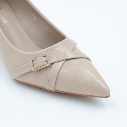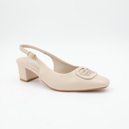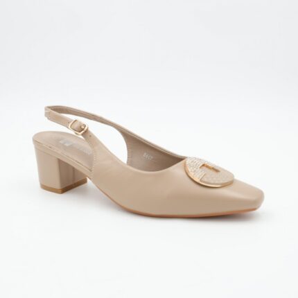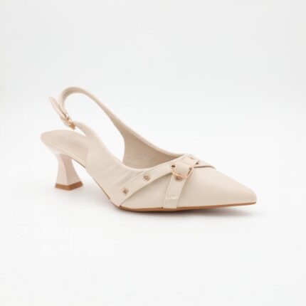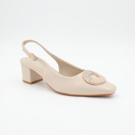 حذاء كعب متوسط نسائي بكعب رفيع وحزام مزخرف بتصميم مفتوح من الخلف لون بيج