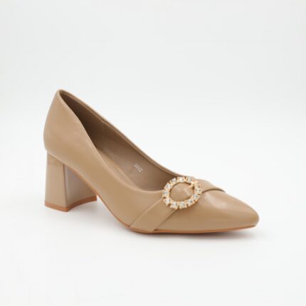 حذاء كعب متوسط رفيع نسائي بتصميم كلاسيكي مفتوح من الخلف لون بيج