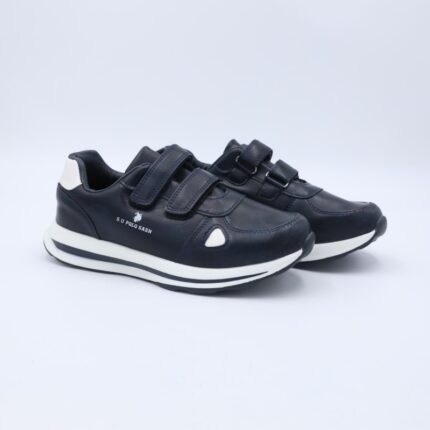 حذاء جلد رياضي بشريطين لاصق لون كحلي وأبيض
