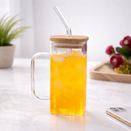 كاسة زجاج شفاف بغطاء بامبو خشبي مع مصاصة ومقبض لون اخضر