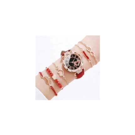 ساعة كوارتز نسائية أنيقة مع خمس أساور ناعمة لون أحمر
