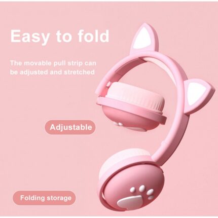 سماعة اذن ستيريو سلكية ولاسلكية مع اضاءة ليد بتصميم قطة لون زهري