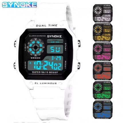 ساعة يد رقمية بثلاث شاشات جلد مطاط لون أسود/ أبيض