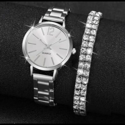 ساعة كوارتز فخمة للصبايا مع اسوارة مرصعة بالسترس اللامع – لون سيلفر