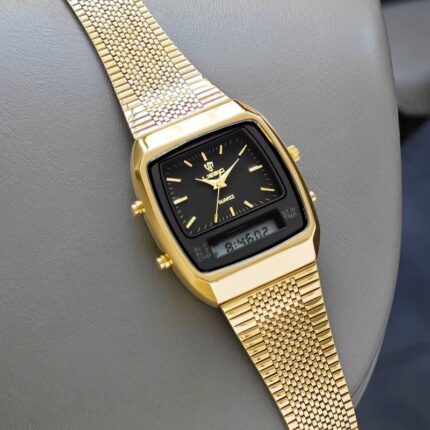 ساعة يد فخمة للرجال ثنائية عقارب ورقمية لون ذهبي ماركة LieBig