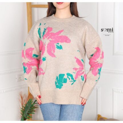 بلوزة صوف بتصميم رسومات ستاتي لون بيج