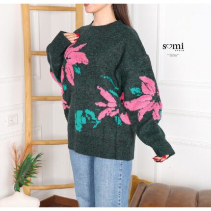 بلوزة صوف بتصميم رسومات ستاتي لون زيتي