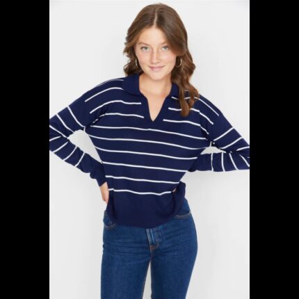 بلوزة تريكو صوف مخطط عرضي للنساء لون كحلي وأبيض