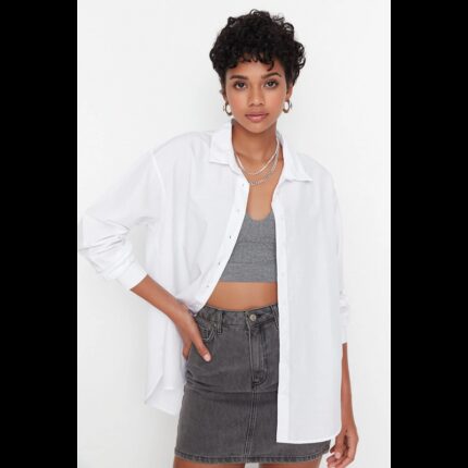 قميص تريندول منسوج قطني بأكمام طويلة وتصميم فضفاض للنساء لون أبيض