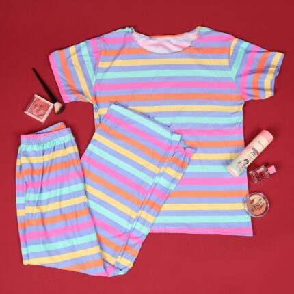 بجامة ستاتي مخطط مكونه من قطعتين بنطلون وتيشيرت قطني ملون