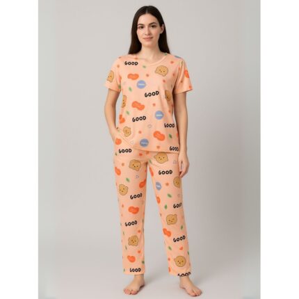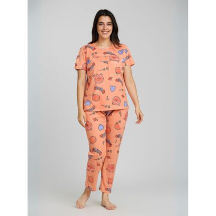بيجامة ستاتية لون برتقالي اشكال ملون بنطلون وبلوزة نص كم