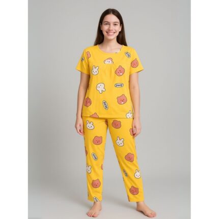 بيجامة ستاتية لون اصفر اشكال ملون بنطلون وبلوزة نص كم