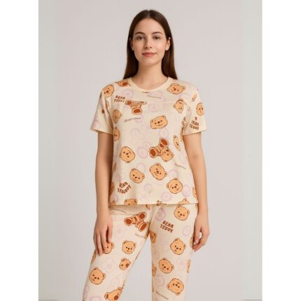 بيجامة ستاتية لون بيج اشكال ملون بنطلون وبلوزة نص كم