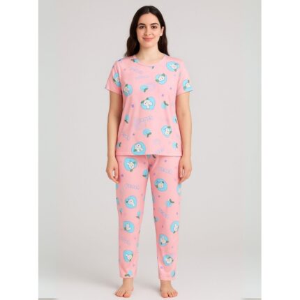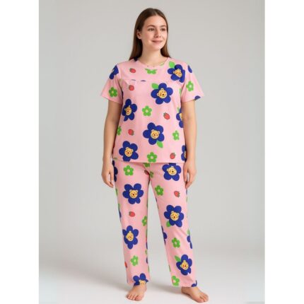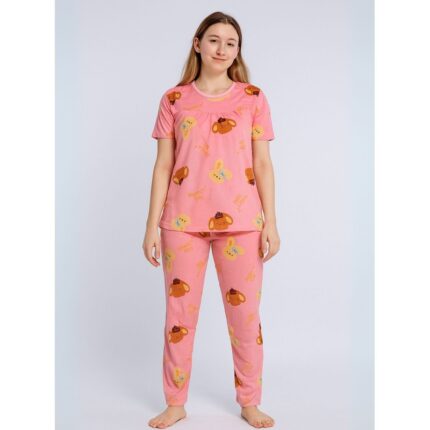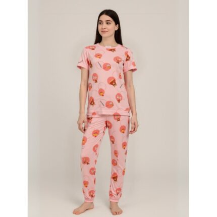 بيجامة ستاتية لون زهري اشكال ملون بنطلون وبلوزة نص كم