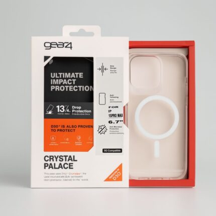 كفر شفاف مع حلقة مج سيف متين ومقاوم للصدمات ايفون 15 برو ماكس ماركة gear4 العالمية