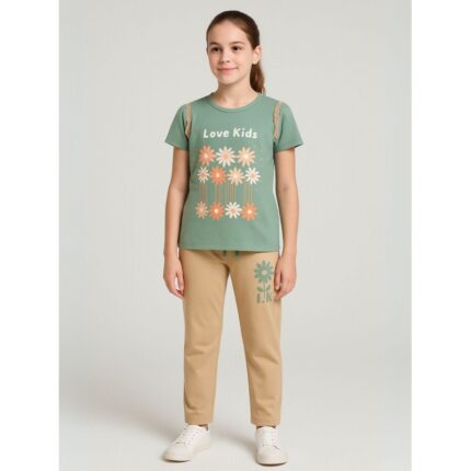 بجامة بناتي بأكمام قصيرة (قطعتين) لون أخضر ووبيج
