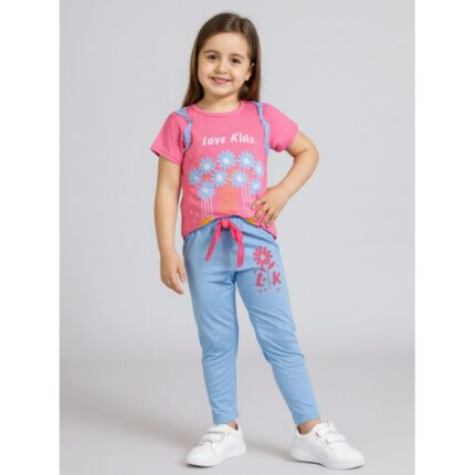 بجامة بناتي بأكمام قصيرة (قطعتين) لون زهري وأزرق