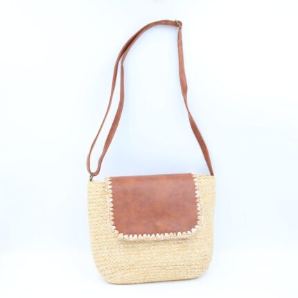 شنتة حقيبة منسوجه من القش مع قطعة جلد
