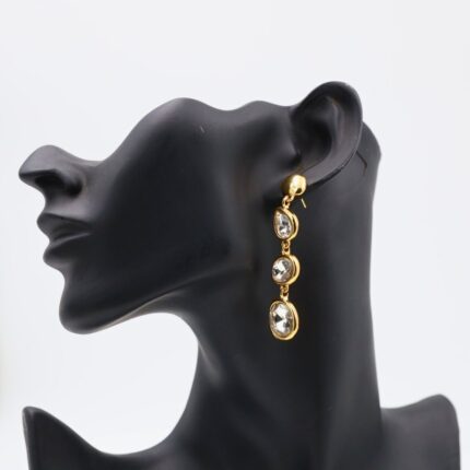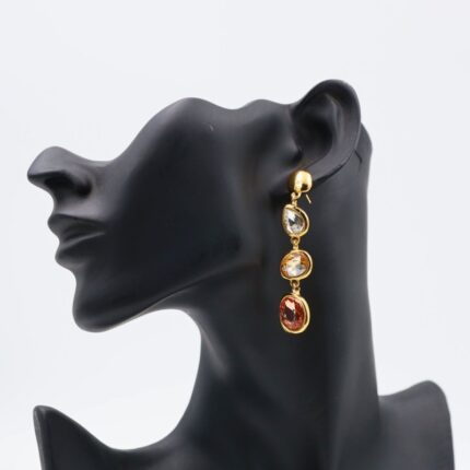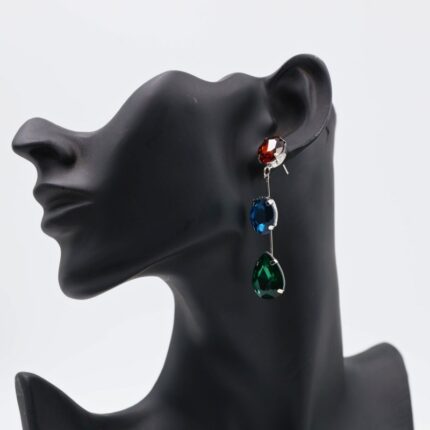 حلق نسائي متدلي بثلاثة أحجار كريستال ملونة أحمر+ أزرق+ أخضر لون فضي